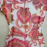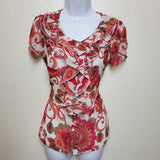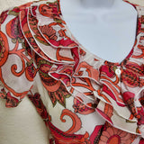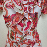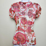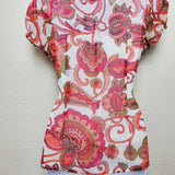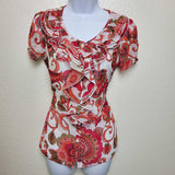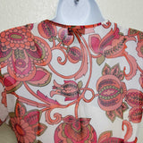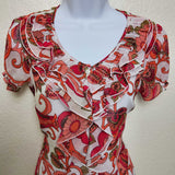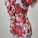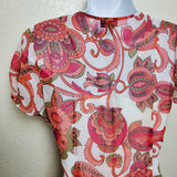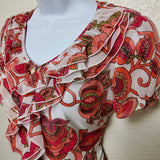 East 5th Pink Ruffle Blouse, Women's Petite Medium. Beautiful pink floral print blouse, with lovely ruffle along torso. You will love how this feels on your skin!!